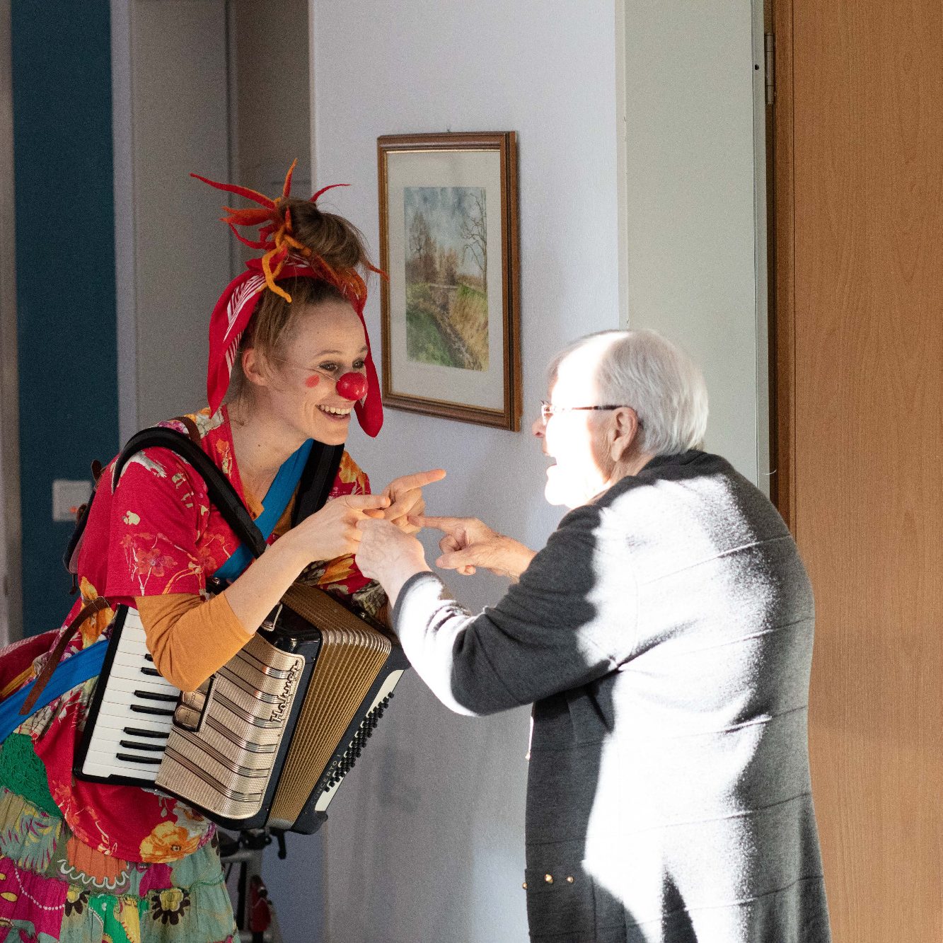 Die meisten Bewohner:innen wünschen sich ihr zu Hause zurück. Wir versuchen im Seniorenheim in der menschlichen Begegnung, Heimat zu schaffen, Vertrauen. Wir erinnern ans Leben, wir schauen uns gemeinsam leichte und schwere Momente an, um dann wieder im Jetzt anzukommen und das, was da ist, nämlich die gemeinsame Zeit in allen clownesken Facetten zu genießen.