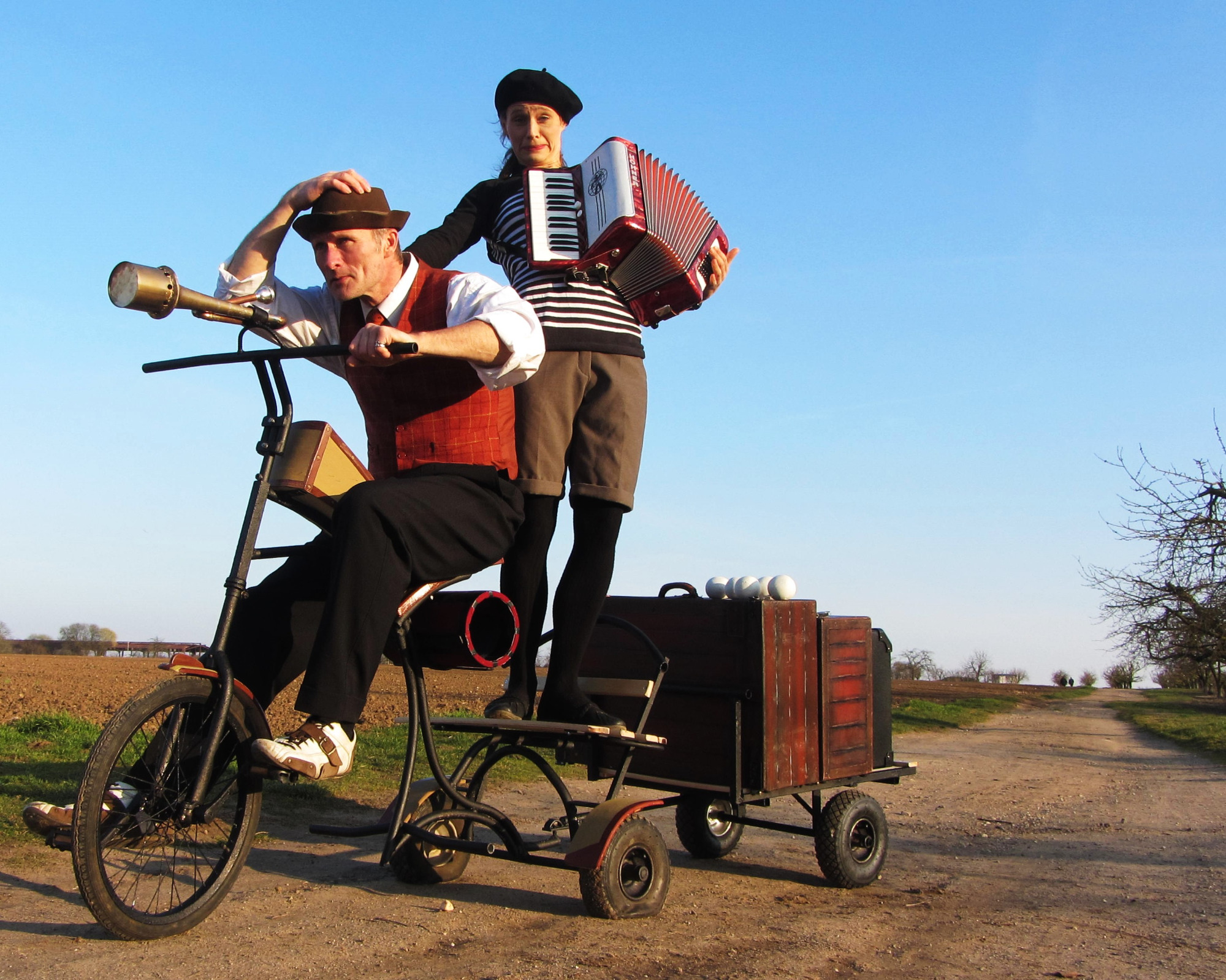 Unterwegs mit Dreirad und Koffer. Und zwischendurch gibt es Haltestellen mit Showeinlagen von 20 Minuten. Ein Mitmachprogramm für Groß und Klein mit Zauberei, Jonglage, Slaptstick, Musik und Freiwilligen, die spontan ins Programm integriert werden.