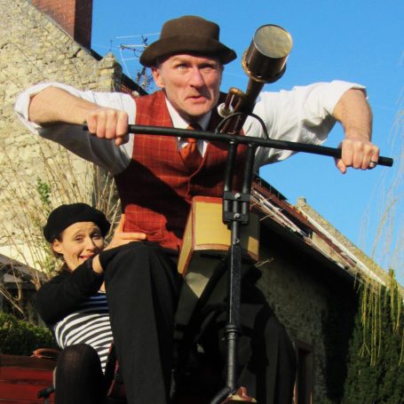 Als Walkact...Ein mobiler Act mit akrobatischen und artistischen Überraschungen. Das Dreirad lädt ein, mitzufahren, schöne Erinnerungsfotos zu machen. Ein fahrender Hingucker, nostalgisch und für jedes Stadtfest geeignet.